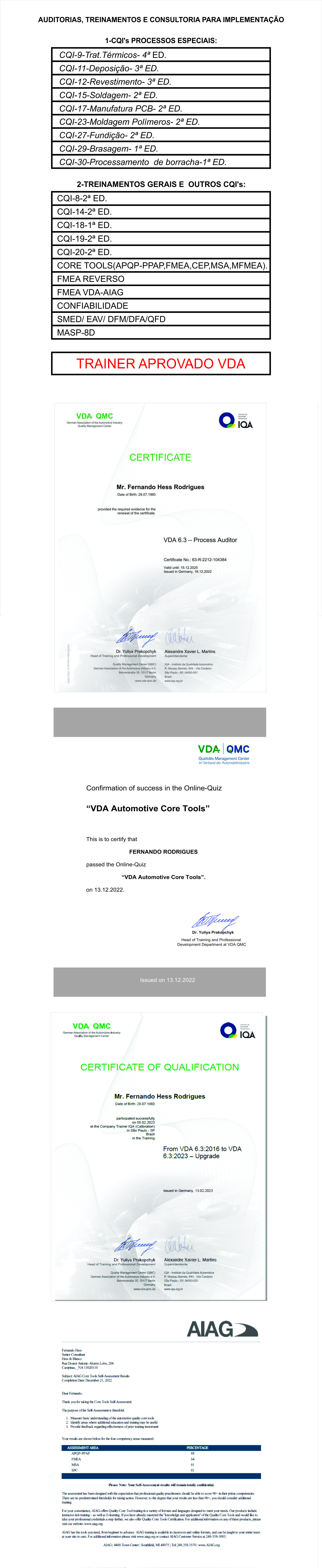 PRESTAÇÃO DE SERVIÇO DE CONSULTORIA NA IMPLEMENTAÇÃO, TREINAMENTO E AUDITORIA NOS CQI's REFERENTES AOS PROCESSOS ESPECIAIS LISTADOS ABAIXO